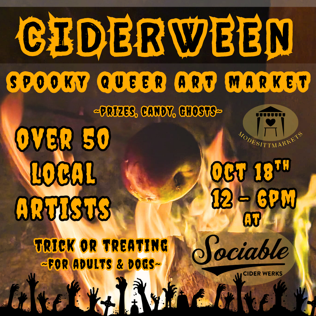Come to Sociable Cider Werks October 18th from 12 - 6pm for a spooky queer art market. There will be prizes, candy, games, and (I was told) ghosts! The market will feature over 50 local artists and trick or treating for adults and dogs!