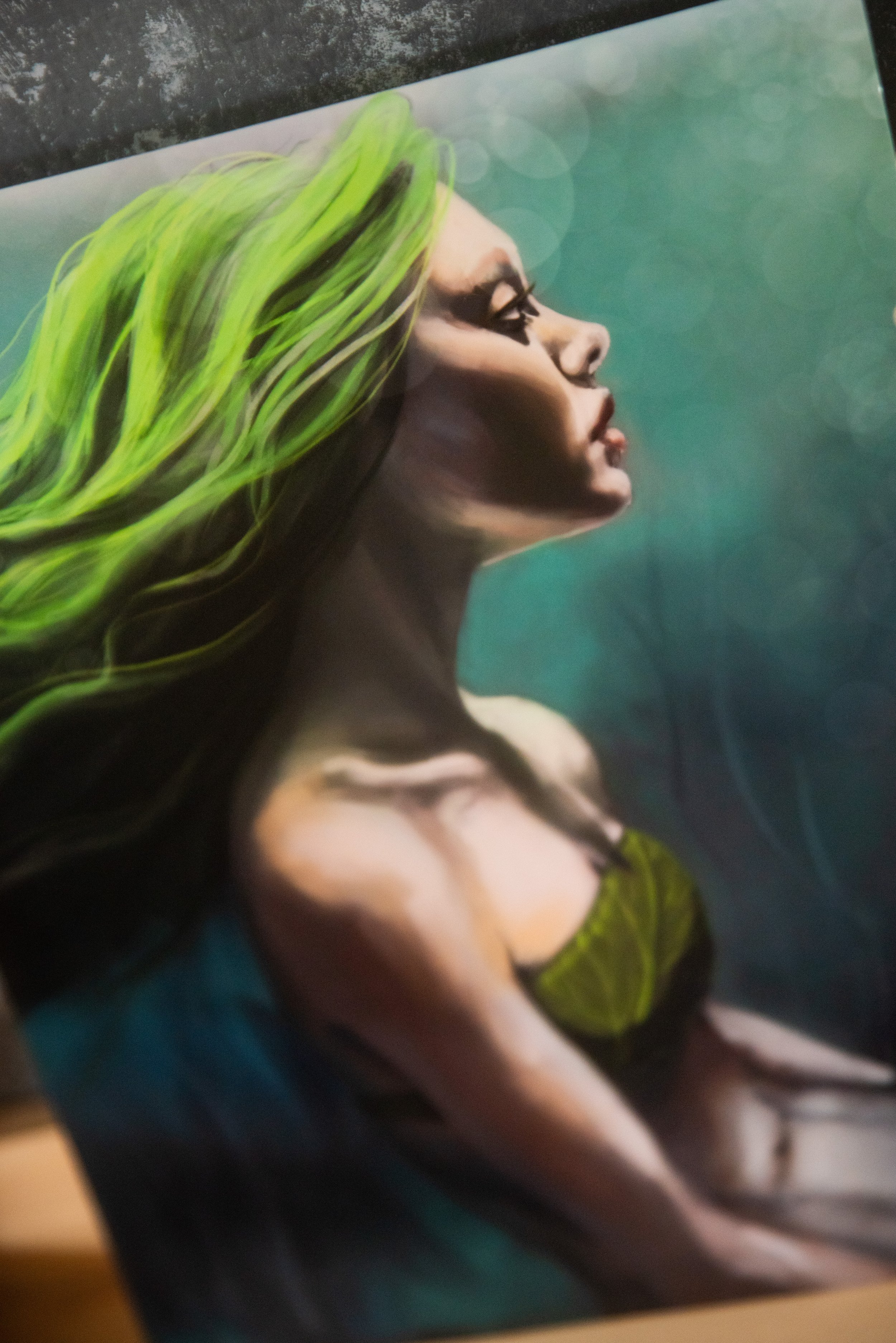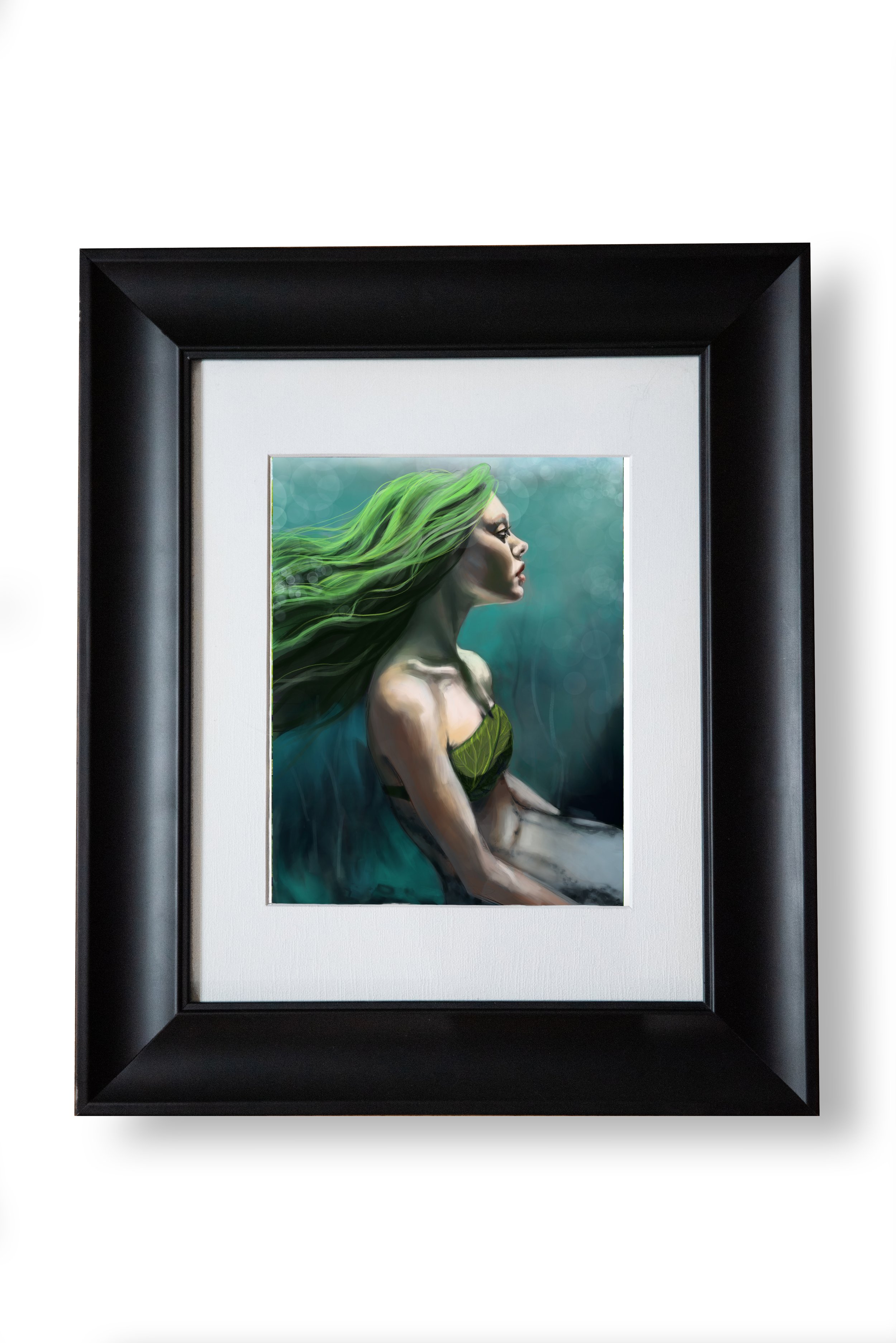 I love an underwater scene. It feels evocative and emotional. I wanted this one to feel more contemplative, so I kept her hair and clothes simple. I wanted her somehow interacting with the ocean, so I put her floating among a cloud of moon jellyfish. She’s a part of them, but separate. It’s about the feeling as much as it is my fascination with underwater scenes.